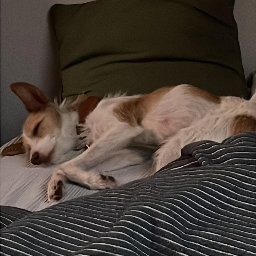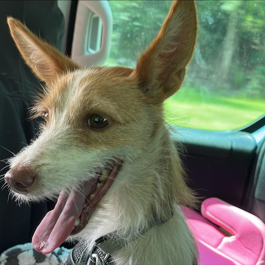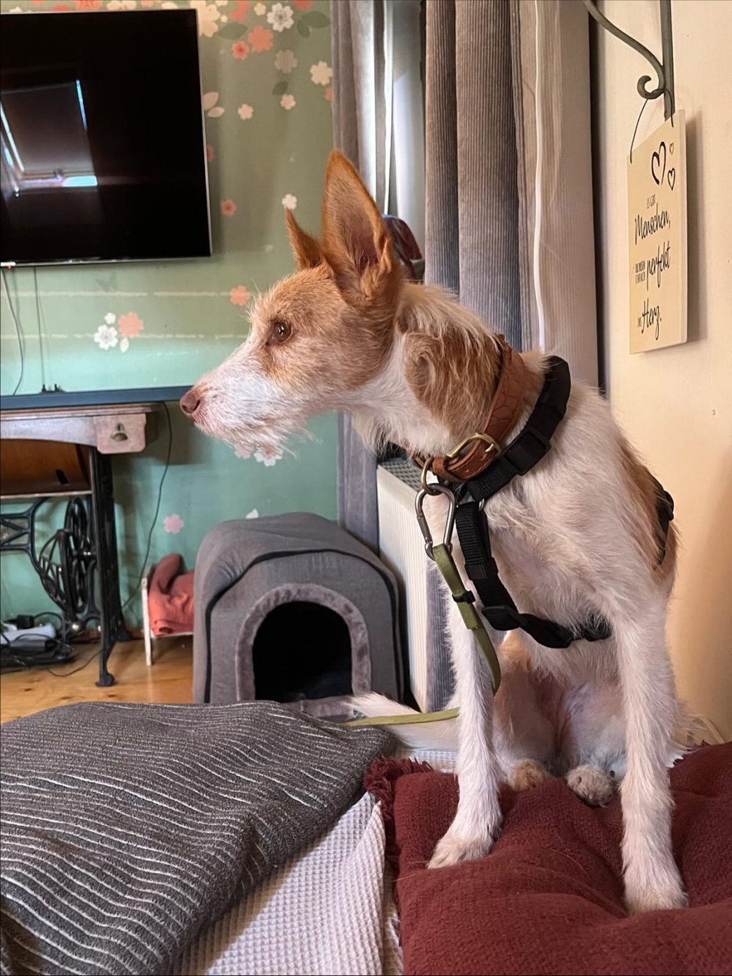 Diekleine Podenco-Mix-Hündin Guinda (ca. 1 Jahr jung) hat schon einiges erlebt. In Madrid wurde sie völlig verängstigt und verschüchtert im Tierheim abgegeben – eine laute und bedrohliche Umgebung für so eine sensible Hündin. Der Stress dort war für sie kaum auszuhalten.