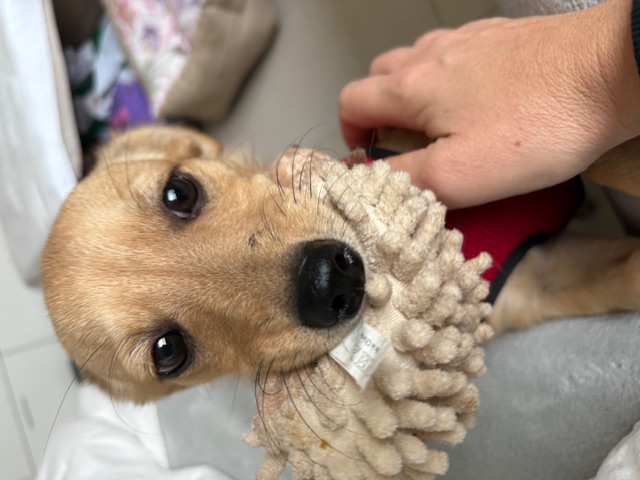 In meiner Pflegefamilie lebe ich mit drei großen Hunden zusammen, die ich prima zu bespaßen weiß. Zum Schlafen kuschle ich mich auch gern zu ihnen ins Hundebett. Meine Pflegemama arbeitet im Homeoffice – das klappt wunderbar. Sie habe ich sogar schon in den Reitstall zu den Pferden begleitet.