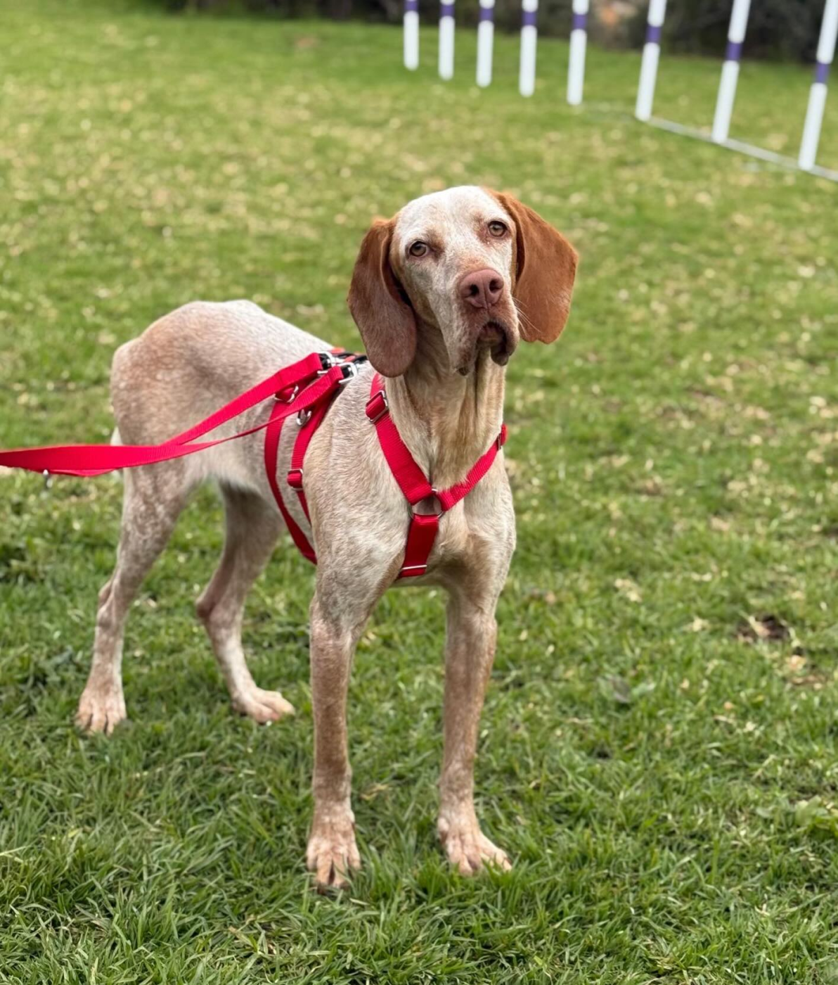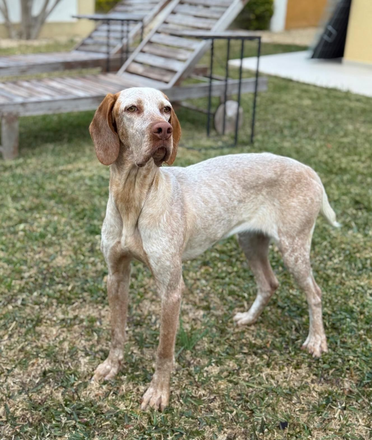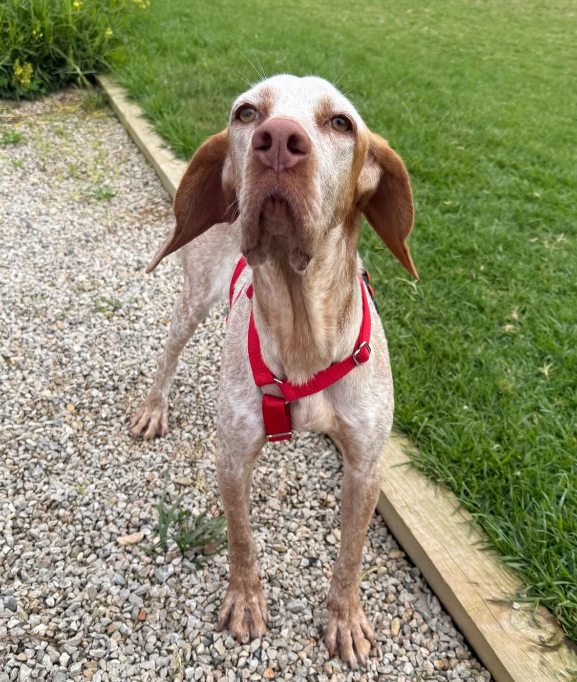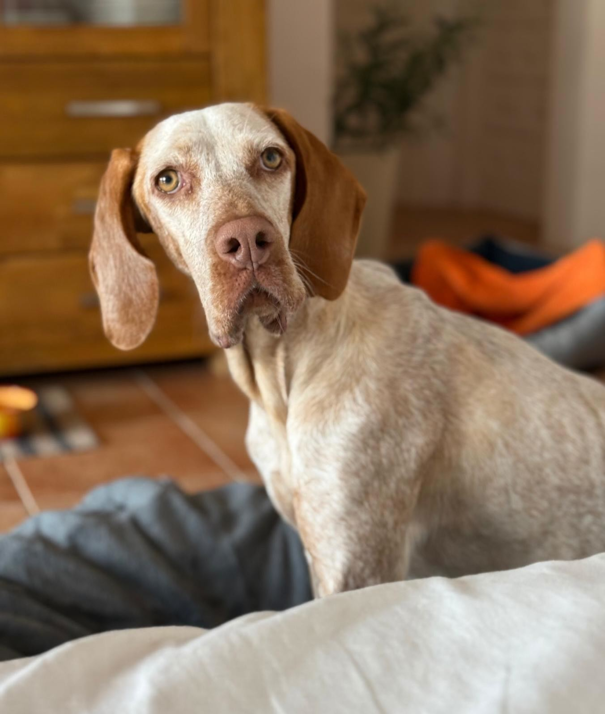 Eine ca. 1,5 Jahre alte Pointer-Mischlingshündin (vermutlich Ca Mè Mallorquí), die aus der Tötungsstation Natura Parc auf Mallorca stammt. Sie wurde dort bereits zum zweiten Mal abgegeben, weil man mit ihrer Ängstlichkeit überfordert war.